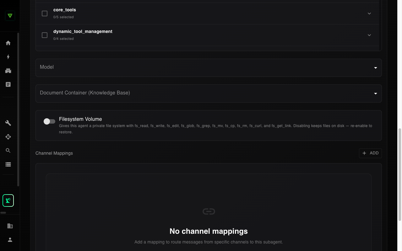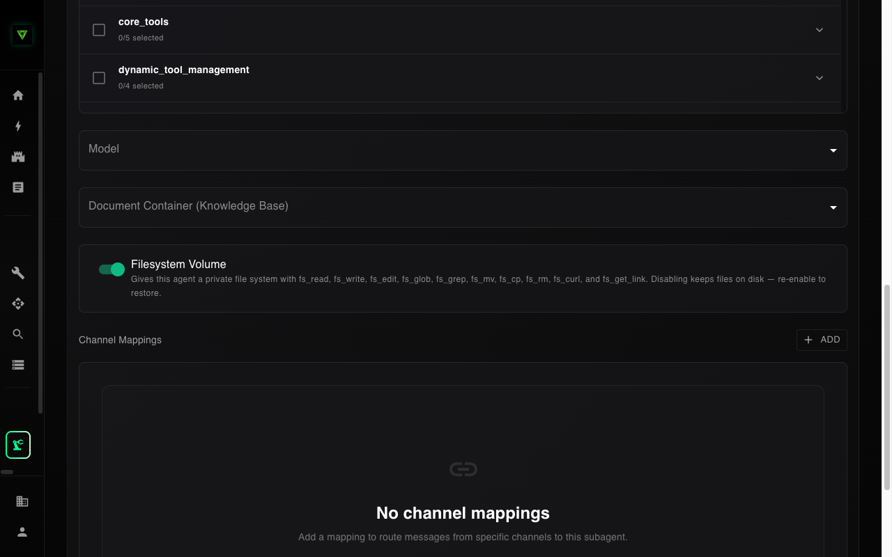 Scroll down through the edit form past the label, description, system message, projects, tools, model, and knowledge base fields. Just above Channel Mappings you will see a bordered panel titled Filesystem Volume with a switch on the left and a short description on the right.