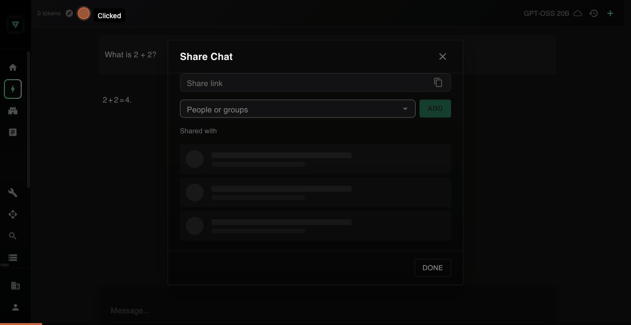 You can share a chat with any individual user or group in your workspace. Recipients must have an active account in the same workspace to access shared chats. Chats cannot be shared with people outside your workspace.